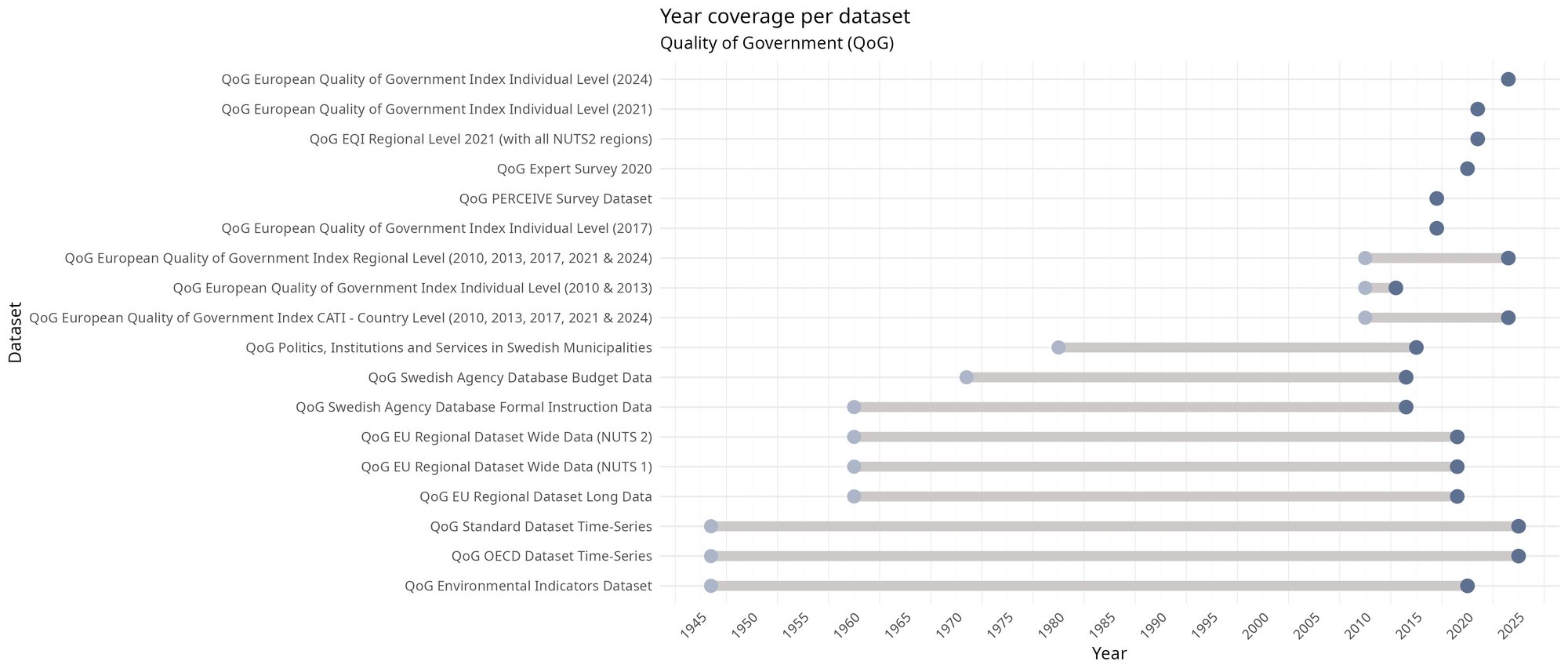The QoG institute offers some of the largest and most comprehensive datasets in terms of thematic breadth and range of sources in the social sciences. The data are all publicly available in four distinct datasets compiled from over one hundred public data sources. The latter datasets are part of QoG’s core operations: